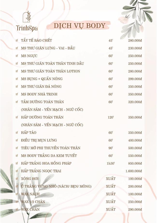 Trinh Spa là một tiệm làm đẹp cung cấp các dịch vụ spa khác nhau, từ spa dưỡng ẩm, trị mụn đến spa thư giãn. Bạn sẽ được sử dụng các sản phẩm chất lượng cao, an toàn và hiệu quả. Bạn sẽ được thưởng thức không gian yên tĩnh và thoải mái, giúp bạn xua tan mọi căng thẳng và mệt mỏi. hãy liên hệ với Trinh Spa ngay hôm nay để đặt lịch hẹn và được phục vụ tận tình nhé!